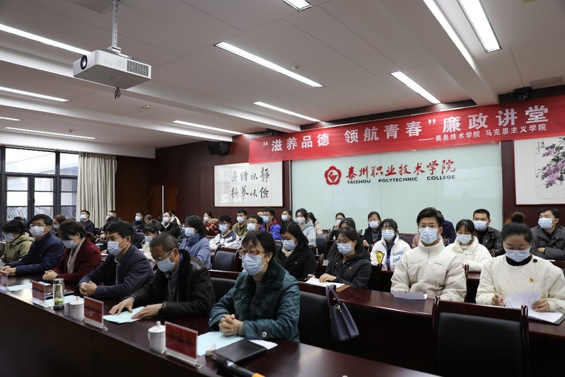 耳边萦绕着泰州历史上的廉吏故事,师生们来到廉政讲堂的第二现场——我院行政楼116会议室,参加接下来的“学廉、警廉、话廉、亲语连廉”四个环节,分别为院纪委副书记、纪委办主任方祝根结合案例对《中华人民共和国公职人员政务处分法》进行解读;观看市纪委监委制作的泰州市警示教育片《贪欲之祸》,用身边事教育身边人;学生代表、教师代表、党员干部代表分别围绕廉政话题,结合个人感悟作交流发言;向我院贫困学生捐赠2021年我院“亲语连廉”廉洁文化作品征集活动集体和个人奖金及部分教师的个人捐款。院党委副书记钟文乐,院党委委员、副院长陈芷全程参加廉政讲堂,对由信息技术学院和马克思主义学院牵头组织的“滋养品德 领航青春”廉政讲堂的“讲廉、学廉、警廉、话廉、亲语连廉”系列活动给予充分肯定,并要求大家认真学习领会泰州历史上的廉吏故事,认真汲取萧竹园中的文化精华,常怀敬畏之心,不断加强学习,做到守纪守法,坚守初心,守好校园一方净土。
